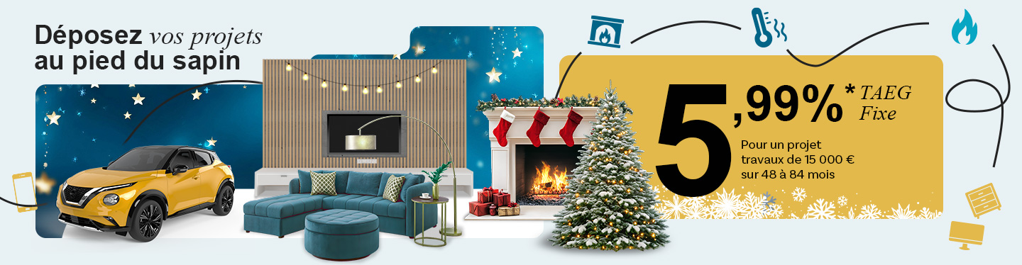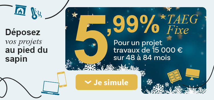 *Offre valable jusqu’au 09/01/2026, pour un projet travaux de 15 000€ de 48 à 84 mois. Sous réserve d’acceptation du prêt personnel par FRANFINANCE (SA au capital de 202 911 984€ – Tour Granite – 17 cours Valmy – CS 50318 – 92800 Puteaux – 719 807 406 RCS Nanterre), Intermédiaire en assurance, N° ORIAS 07 008 346 (www.orias.fr). Assurances souscrites auprès de SOGECAP et SOGESSUR, entreprises régies par le Code des Assurances. FRANFINANCE, SOGECAP et SOGESSUR sont des filiales du Groupe SOCIÉTÉ GÉNÉRALE. Vous disposez d’un délai de rétractation de 14 jours à compter de la date de signature du contrat de crédit.